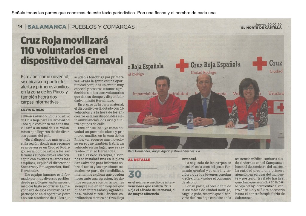 La primera pregunta consistía en identificar las partes de un texto periodístico, concretamente de una noticia publicada el día 19 de febrero por Silvia García Rojo en El Norte de Castilla.