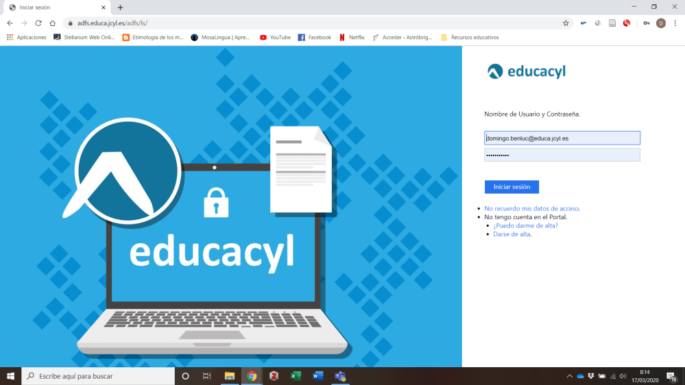 A la hora de introducir el usuario, utilizad el correo entero (en mi caso, domingo.benluc@educa.jcyl.es)