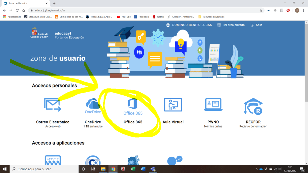 El acceso a Teams se hace desde el apartado de «Office 365» de Educacyl. Vamos paso por paso.