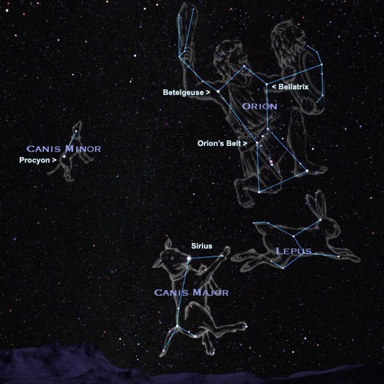 Así lo hizo, y desde entonces brilla en el cielo, acompañado de sus dos perros de presa (canis minor y canis mayor), de distintos animales y, siempre, escapando de un gran escorpión.