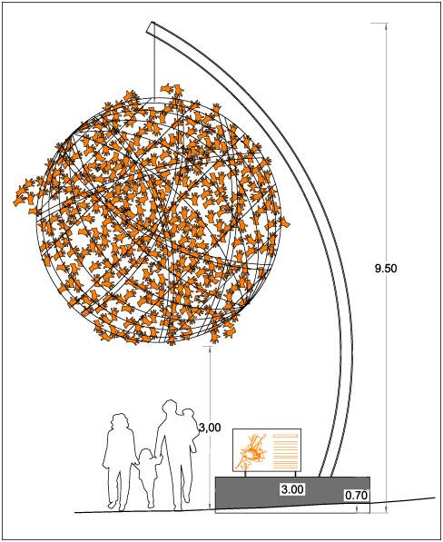 Como ya te he indicado anteriormente, el Sol va a ser una estatua que tendrá una altura de unos 9,5 metros de alto y que estará compuesta por distintos materiales. Entre ellas, habrá hasta 2000 manos de latón, un material con aspecto dorado, que le darán una apariencia única.