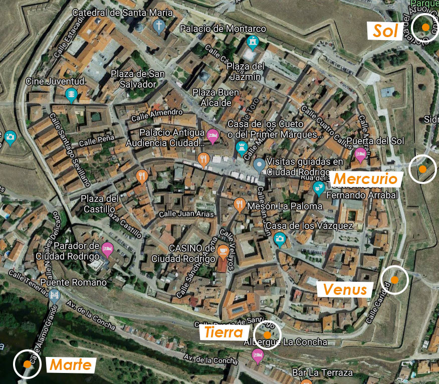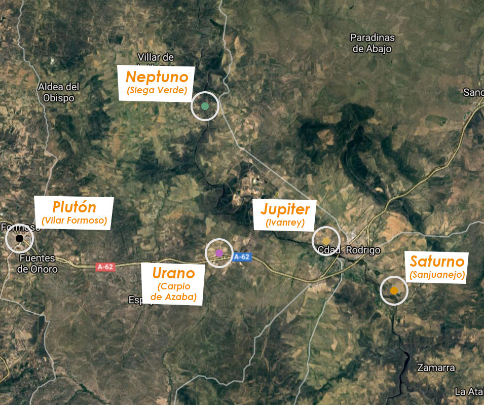 Cada uno de estos planetas y elementos estaría situado en distintos puntos de Ciudad Rodrigo, pero algunos tendrían que situarse fuera. Así, por ejemplo, Neptuno tendría que estar en Siega Verde. Y el planeta enano Plutón llegaría hasta Portugal.